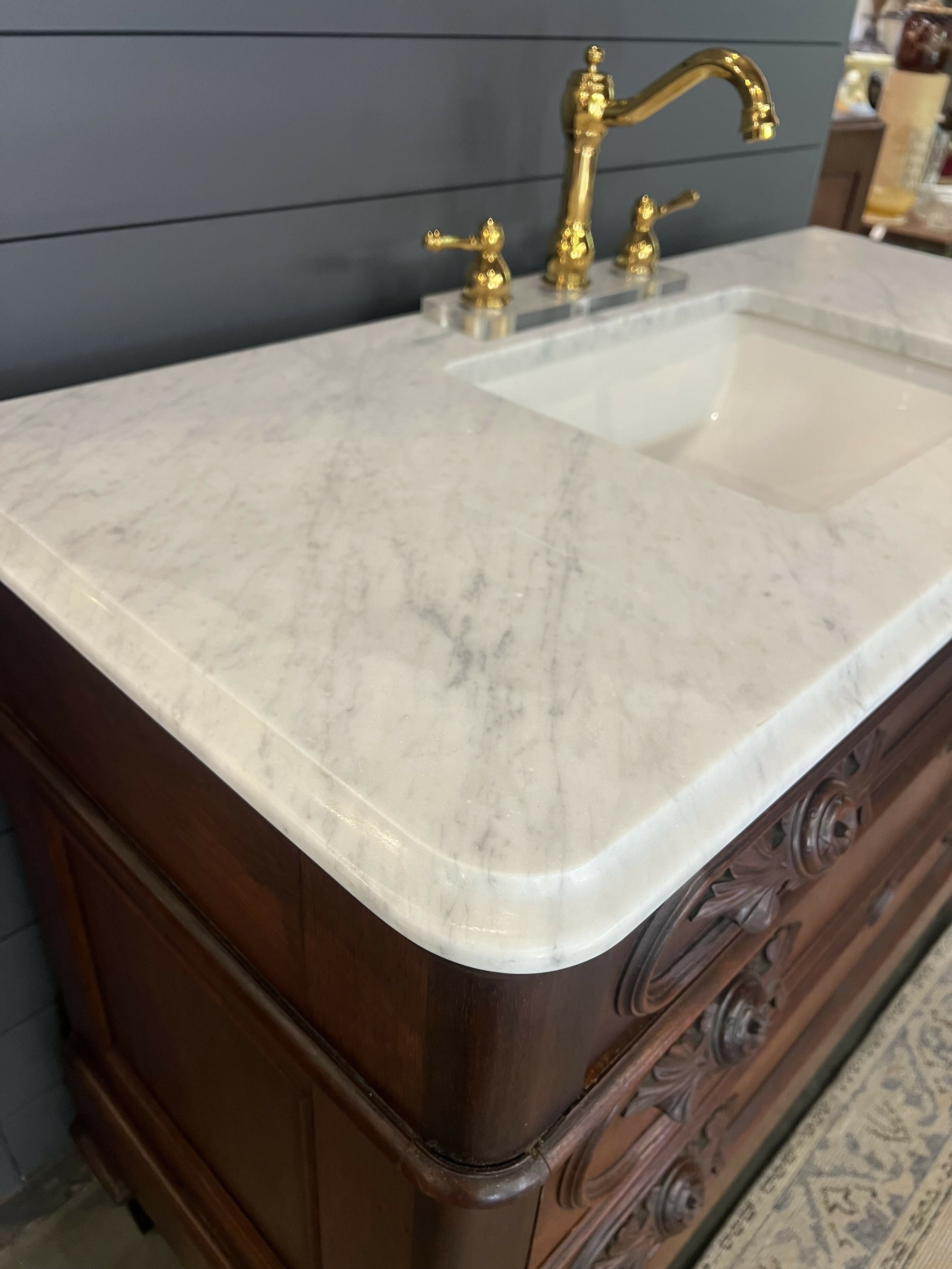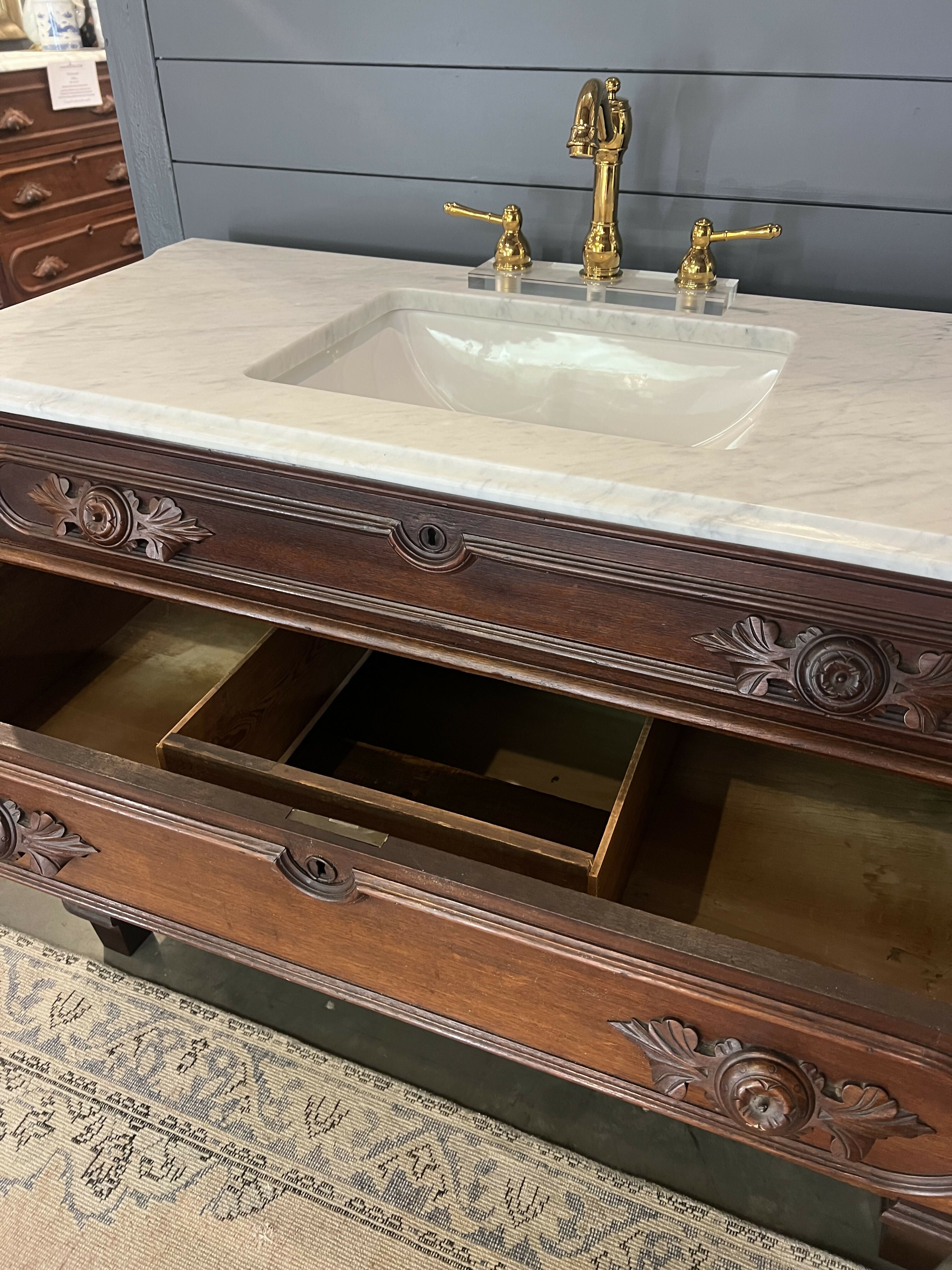 Antique Victorian Walnut Dresser bath vanity with marble top and undermount sink, fully retrofitted for interior plumbing. Designed for 8” widespread faucet. Faucet not included.